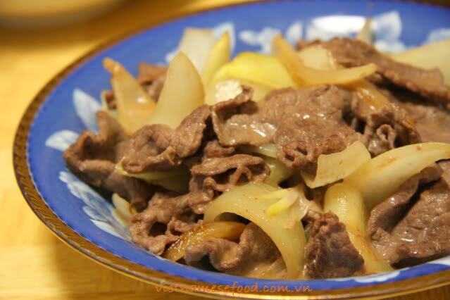 Stir-fried Beef with Ginger and Onions (Bò Xào G?ng và Hành Tây) which is one of Traditional Vietnamese Food; is my very first foray into stir frying beef. After taking inspiration from cooking series on television, I proceeded to the supermarket, bought myself some beef flank slices, spring onions and ginger and did this. As I did not memories her recipe, I more or less guessed the seasoning involved. There was an added bit of anxiety as we had two friends over for dinner and I was going to serve them something I am cooking for the first time.