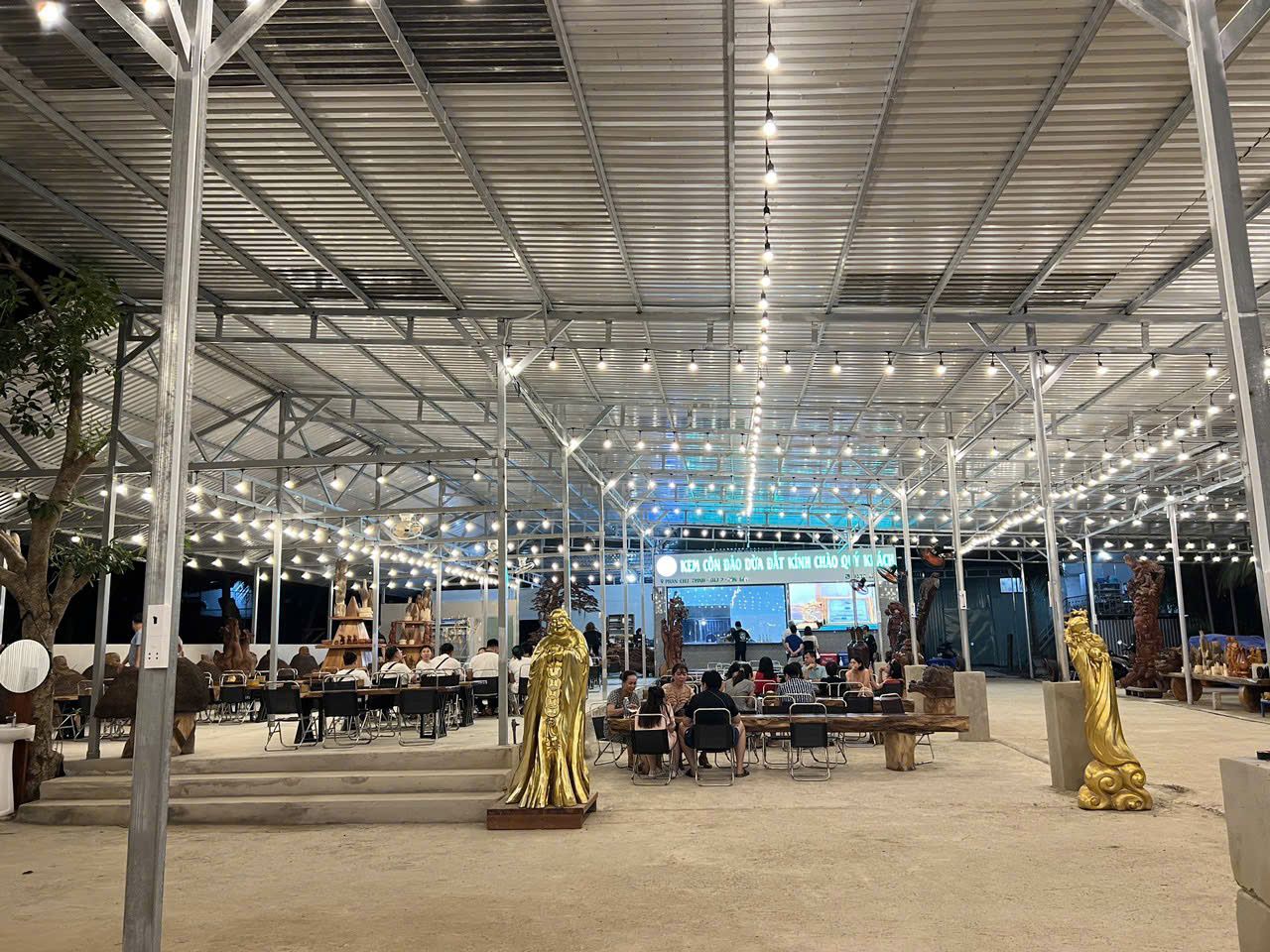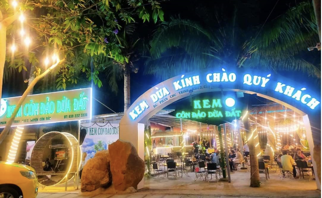Quán Kem dừa Côn Đảo Dừa Dất được trang trí nổi bật với ánh đèn lung linh, hàng dừa xanh mát, tạo nên một điểm check-in hấp dẫn về đêm. Đây không chỉ là nơi để thưởng thức kem mà còn là điểm hẹn lý tưởng cho du khách và người dân địa phương, mang đậm sắc màu trẻ trung, sôi động của đảo ngọc.